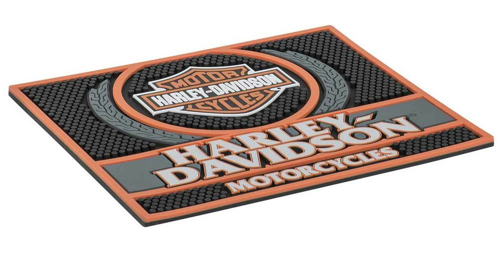 Harley-Davidson® Motorcycles Bar Mat, HDL-18591. Custom contoured rubber bar mat. Harley-Davidson® logo with Bar & Shield and complementing tire tread accents. Top rack dishwasher safe. Dimensions: 14" L x 12" H x 0.25" D.