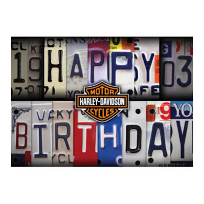 Send your Harley®-est birthday greetings with this unique card. Your message is spelled out from clips of embossed license plates and accented with the iconic Bar & Shield® in the center. Part Number: HDL-20002