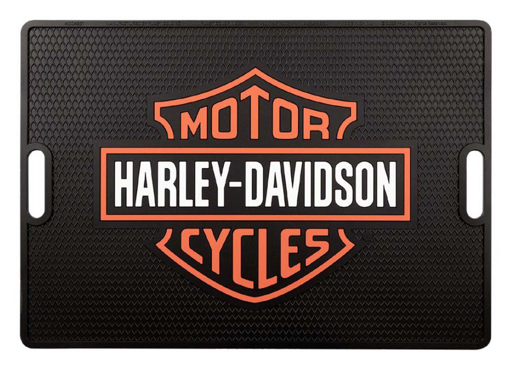 Harley-Davidson® Action Mat - Black, 4887. Multi-purpose action/garage mat. High-quality thick rubber construction. Easy to clean with soap and water, with vibrant molded colors that will not fade. Embossed iconic Bar & Shield logo. Size: 24" x 16".