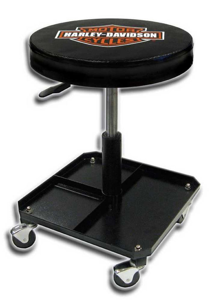 Put the bike on the lift and crank it up a few feet - now you're ready to do some maintenance. Knowing you are going to go at it for several hours, it might make sense to be as comfortable as possible while working, reaching for a tool, or changing positions. The Harley-Davidson® Bar & Shield® Shop Swivel Stool is the answer, and it what you need to fight fatigue. With an adjustable seat height, the stool works for everyone. The stool includes a convenient tool tray at the bottom, and rolls around on precision swivel wheels. The seat is padded, and features the classic orange Harley-Davidson® Bar & Shield®. Feel confident that you'll have a steady hand whatever the maintenance requirement is when using this shop stool.