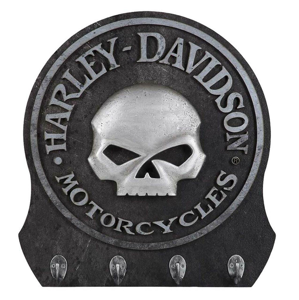This Harley-Davidson® 3-D Skull Key Rack, HDL-15313, features the famous Willie G skull Harley-Davidson® logo. You’ll be comforted in knowing that each time you grab your keys, Willie is “watching” out for you. It’s a perfect addition to your garage, an entry hallway, mud room, or a utility room leading to the garage. It is 12.5-inches wide and 13.5-inches high. It comes with four hooks, a number found to be perfect after exhaustive research – not three or five but four – exactly four. Perfection! Hang keys or anything else that you might think of that can be hung by a hook, like scarves, ID lanyards, a hat, etc. Features include hand finished, custom sculpted 3-D skull and applique letters. A textured finish completes the look, and it is ready to hang. Dimensions: 12.5"W x 13.5"H x 1.5"D. You will be able stay organized in Willie G style with this rack. This key rack is made by Ace Branded Products, a Harley-Davidson® licensee for almost 70-years, and the sole distributor of the Harley-Davidson® ROADHOUSE™ Collection, which features Room Décor items like Bars, Bar Stools, Café Tables, Neon Clocks, Mirrors, Pool Tables, Billiard Accessories, and much more! When it’s Ace and Harley-Davidson®, it is a winning combination. HDL-15313.