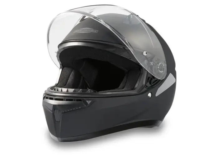 At the intersection of comfort visibility and protection you'll find our H-D Velo H34 Full Face Helmet. Its certified design is made from a polycarbonate composite and wisely features an advanced vent system that flushes out heat and humidity while you ride. This full-face motorcycle helmet also has a rear spoiler to reduce drag grooves to accommodate eyewear and an anti-scratch face shield. Its matte finish is subtly branded with our stacked diamond logo on the front and back. Know the history this 1963 logo was extended horizontally to better fit our motorcycle gas tanks. Learn more in the specs below then order ASAP while supplies last.