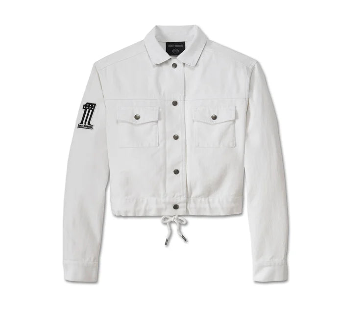 Honor our winning flat track heritage in style on the Limited-Edition #1 Racing Cropped Jacket. Crafted from rugged yet breathable heavyweight cotton twill, its cropped fit has a dropped yoke and adjustable drawcord waistband. It uniquely features reflective fabric under the collar for added visibility, and hidden snaps to keep your collar in place. This women’s jacket earns extra style points for its race-inspired graphics on the back and sleeve. In fact, the #1 Logo here was originally created in 1969 to celebrate our AMA Grand National Championship Title.