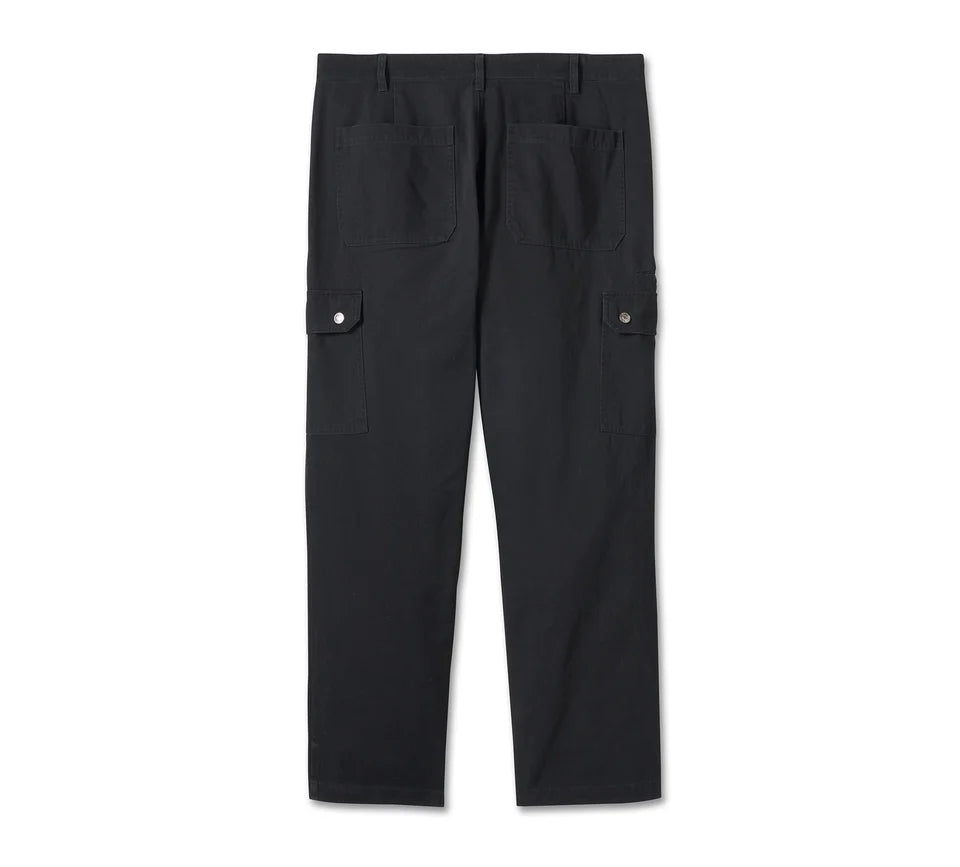 For classic style plus move-with-you comfort, cart our Limited Edition The Trooper Cargo Pant. Ruggedly made from heavyweight cotton twill that’s enzyme washed for softness and a well-worn look. The straight leg style of these men’s cargo pants feature side cargo pockets with snap flap closures, plus ample pocket space that includes a cell phone pocket. Go with the solid Black Beauty or printed Camouflage option, both minimally branded to pair well with your favorite H-D tee, hoodie, or button down shirt. Order now—this seasonal favorite is moving fast. Straight fit. Sits at waist. Straight fit through hip & thigh. 100% cotton heavyweight twill, enzyme washed. Zip front fly with branded button closure. Slanted front pockets. Back patch pockets and side cargo pockets with branded snap closures. Welt side cell-phone pocket. Cargo pant silhouette. Allover print, Branded woven label. 30", 32", 34", 36".