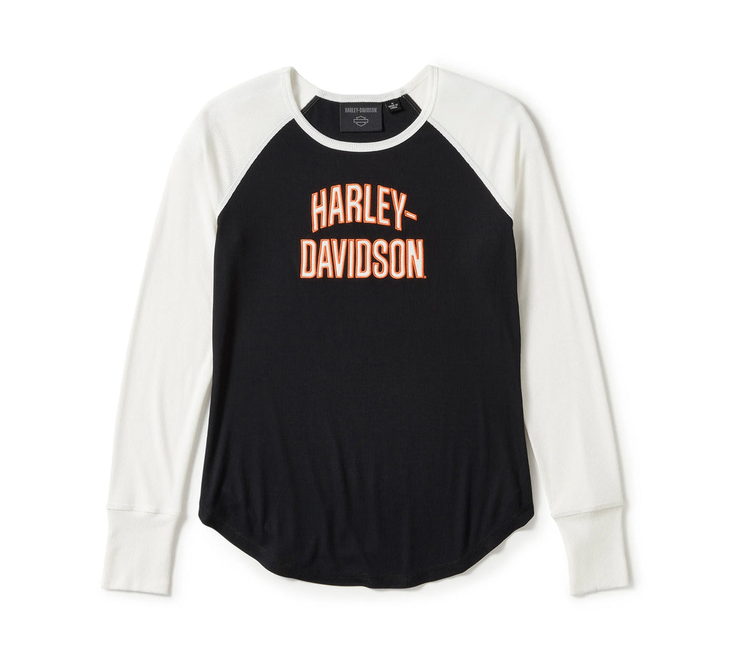 Keep it casual yet moto-inspired in our Essential Arched Font Long Sleeve Raglan. Crafted from a ribbed modal/polyester/spandex blend for move-with-you comfort in a textured look (zoom in to see). This women’s Raglan baseball style tee classically features contrast raglan sleeves and a flattering scoop neckline. It’s finished with our most iconic Bar & Shield on back and arched graphics on front that mimic our 1930s racing jerseys.
