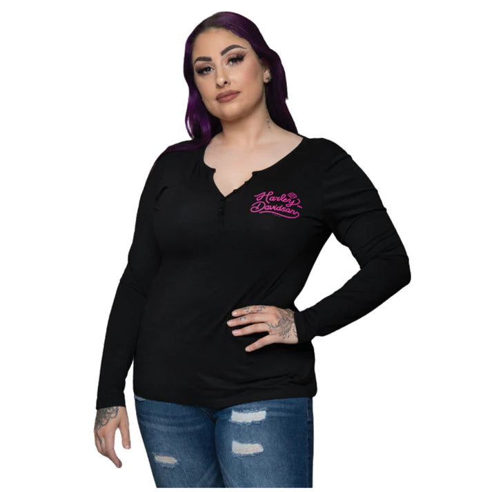 Womens Perth & Rockingham Harley-Davidson dealer short sleeve dealer T-shirt with the Perth or Rockingham dealer name printed on the back. Made with 100% Cotten with stylish prints on both the front and back made to a comfy fit. CHOOSE DEALERSHIP AND SIZE BELOW