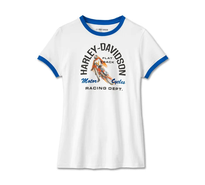Get a trackside view of racing action on the Limited-Edition Lowside Ringer Tee. Cut from cotton jersey with a rib-knit neckline to help keeps its shape. Finished with a throwback design that honors the 1970s Harley-Davidson factory team racers. This distinctive women’s graphic t-shirt is in high demand—order yours ASAP.