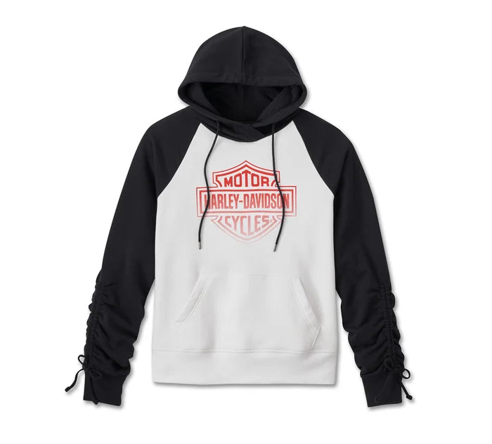 Hoodie comfort gets a style upgrade in this Limited Issue. Made from cotton/polyester fleece, our Simmering Bar & Shield Hoodie features contrast raglan sleeves and hood plus sleeve ruching to elevate its look. This women’s long sleeve fleece is branded with a gorgeous gradient print from our fiery seasonal color palate. Order now while supplies last.
