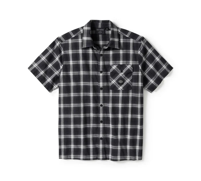Easy-breezy plaid style gets an H-D upgrade on our Staple Short Sleeve Shirt. It’s cut for longwearing comfort from breathable yet durable all-cotton twill that’s peached for softness. This men’s button down features a button-closed chest pocket plus a hidden snap-down collar that stays put under riding gear. Our woven label graces the front for a lowkey Harley-Davidson look.
