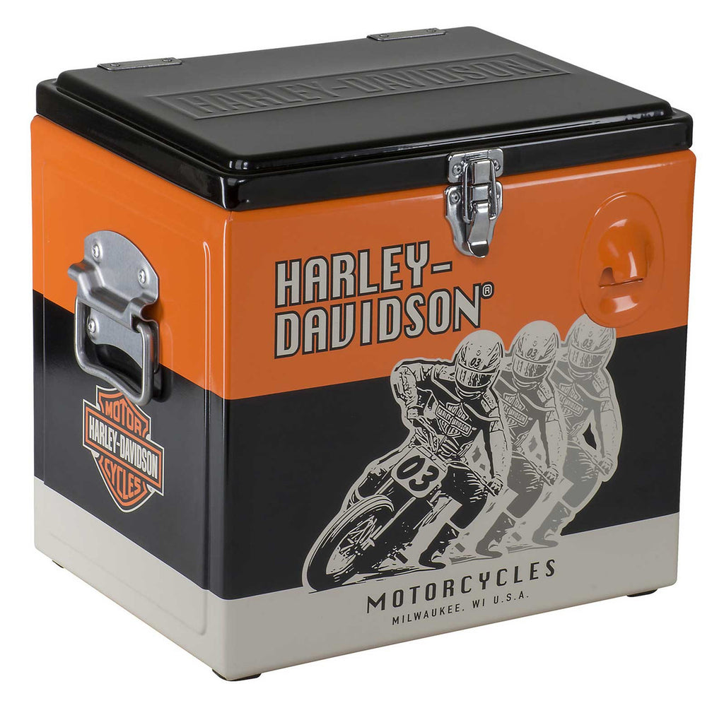 Harley-Davidson® Racing Retro Metal Cooler, HDL-18599. 15 Liter metal cooler features H-D Racing graphics and embossed Harley-Davidson® on the lid. Built-in bottle opener included. Dimensions: 12.5" L x 10" D x 12" H.