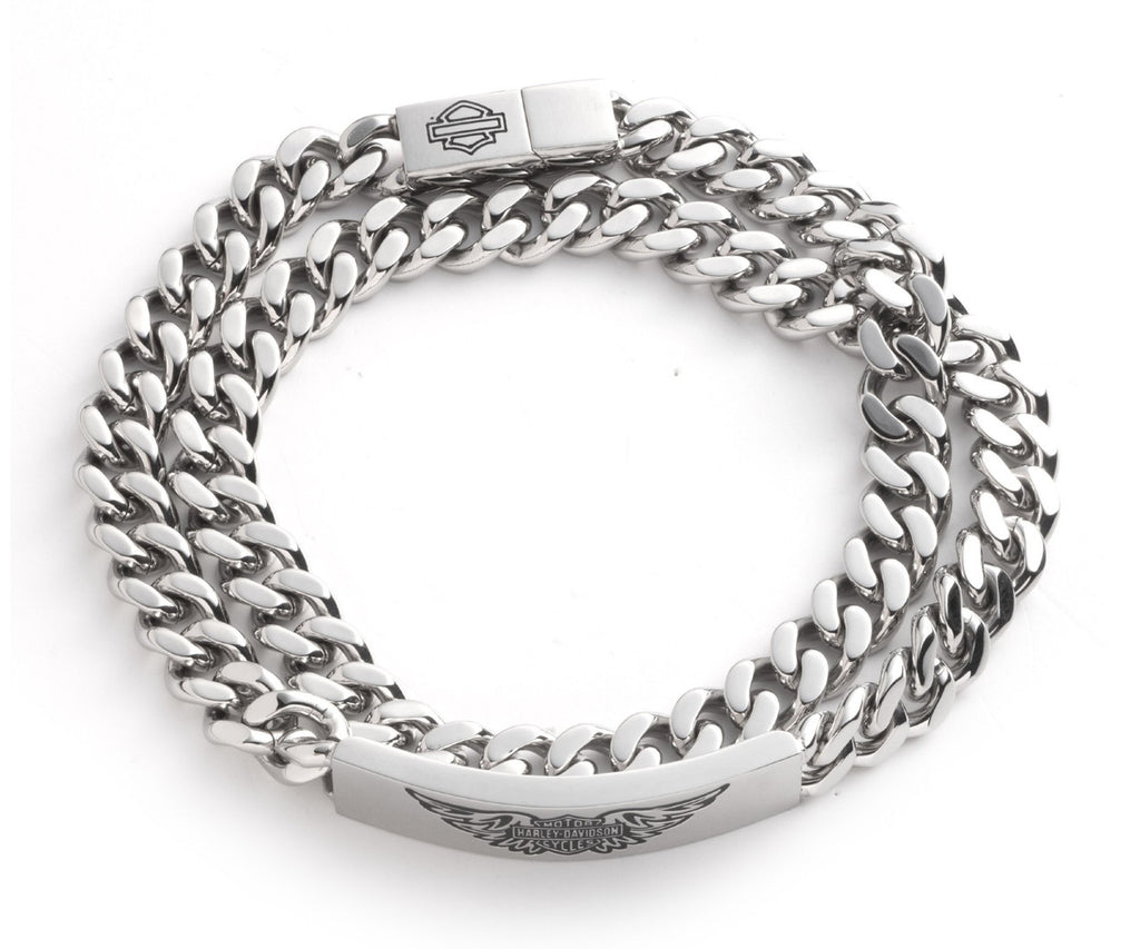 Harley-Davidson® Men's 17" H-D Winged Bar & Shield Double Wrap Bracelet. This 17" double wrapped chain bracelet is crafted from high quality stainless steel. Features a winged bar & shield front plate, with a magnetic clasp closure, also featuring an iconic bar & shield logo.