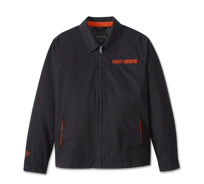 Mechanic-inspired style shares a lane with our motorcycling legacy on the Bar Font Jacket. Built from rugged heavyweight cotton twill that’s washed for softness and a worn-in vibe, it has a hidden snap-down collar that won’t flap around under riding gear. Its retro-meets-modern look features pops of contrast in the trim, graphics, and inside taping. This men’s outerwear jacket is handsomely finished with our bar font branding plus a sleeve hit of our open Bar & Shield.