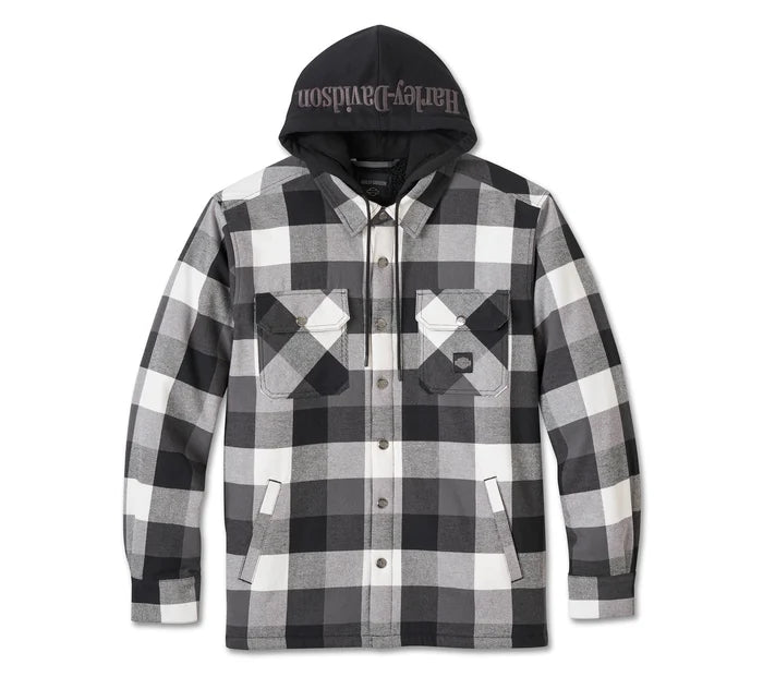 Plaid gets added warmth and a Harley upgrade on the Traveler Hooded Shirt Jacket. Made from a rugged cut of brushed cotton twill with a cozy polyester Sherpa body lining plus lightly insulated sleeves. This snap front men’s outerwear features ample pocket space for stashing essentials and a hidden snap-down collar that stays in place under riding gear. The jacket’s buffalo plaid pattern is minimally branded with our woven label, while the hood features handsome embroidery. In fact, the hood graphics mimic the lettering style of our 1970s Baja race uniforms.