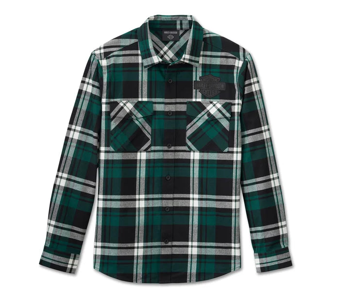 Level up your plaid look for all the season’s festivities in our Bar & Shield Flannel Shirt. It’s made for true comfort from rugged cotton twill that’s brushed for softness. This men’s long sleeve button down features chest pockets for stashing essentials plus a hidden snap-down collar that stays put under riding gear. Its stylish pattern is the perfect backdrop for the jersey appliqué of our most beloved logo on front. Snag yours before they disappear.