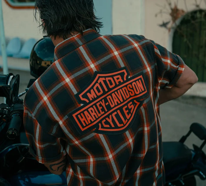 Level up your box plaid look in our Bar & Shield Staple Short Sleeve Shirt. It’s cut for longwearing comfort from breathable yet durable all-cotton twill. This men’s button down features a pen stall and a hidden snap-down collar that stays put under riding gear. Finished with our iconic Bar & Shield gracing the front and going all in on back for a classic Harley-Davidson look.