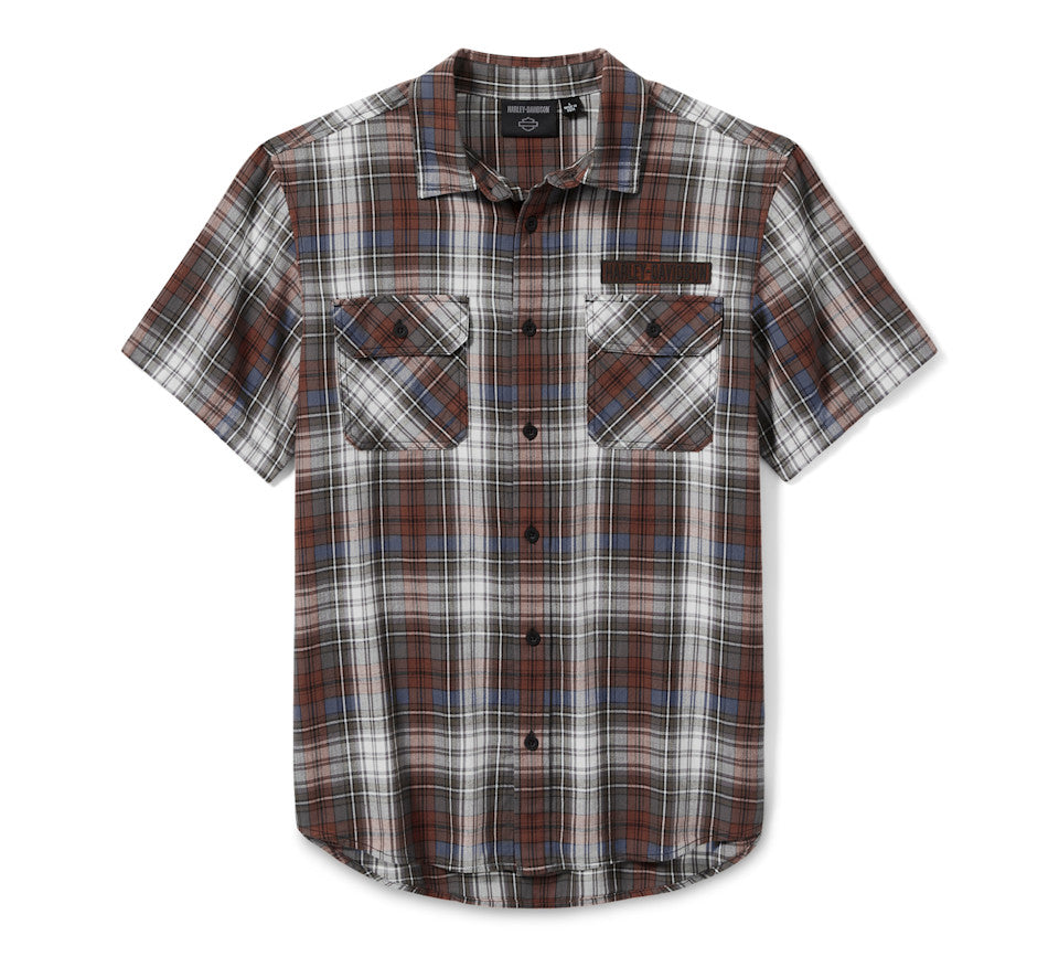 Clean up nice while staying true to your moto style in our Block Font Yarn Dyed Plaid Shirt. Made durable yet breathable from lightweight cotton twill that’s washed for a worn-in feel. This men’s short sleeve button down features a shirttail hem that looks great tucked in or out, a handy pen stall on the left chest pocket, and a hidden snap-down collar that stays put under riding gear. Finished with oversprayed embroidered patches on the front and back for a throwback, workwear-inspired vibe. 100% cotton lightweight twill, garment washed. Button front. Button flap chest pockets with pen stall (wearer’s left). Hidden snap-down collar. Shirttail hem. Embroidered twill patch with overspray.