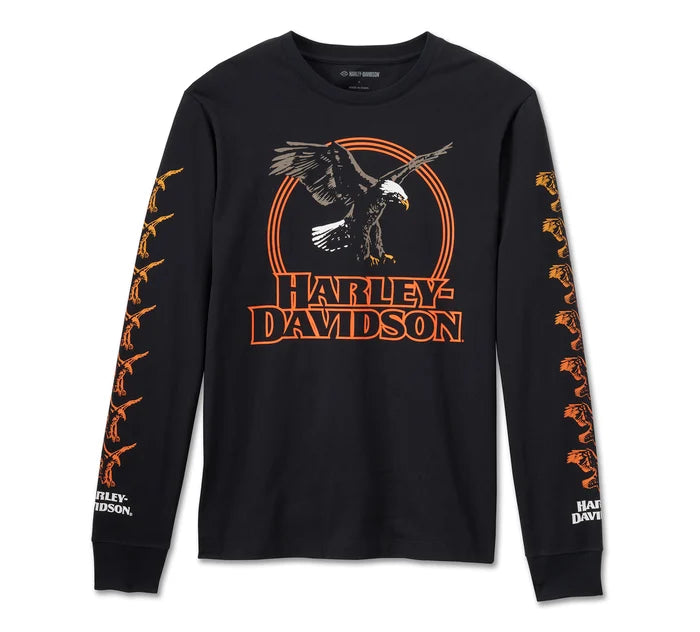 Casual comfort is retooled with a retro vibe on our Limited-Edition Rising Eagle Long Sleeve Tee. Its relaxed fit is made from heavyweight cotton jersey with a rib-knit neckline and cuffs to help keep its shape. This long sleeve men’s tee is finished with a gradient print of eagles perched along the sleeves and our seasonal graphics on front. In fact, its look is inspired by H-D dealership and rally tees from the 1980s. Snag yours while supplies last.