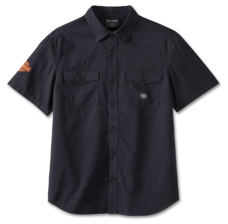You’ll clean up nice and keep it classic in our Whiplash Shirt. That’s because this short sleeve men’s shirt celebrates our earliest branding on the back yoke plus our legendary Bar & Shield on the sleeve, both in a pop of color. Made from durable cotton twill that’s enzyme stone washed for softness, it features hidden snaps so your collar won’t flap around while you ride. It’s a tried-and-true Harley look that’s ideal for workdays, date nights, or rallies.