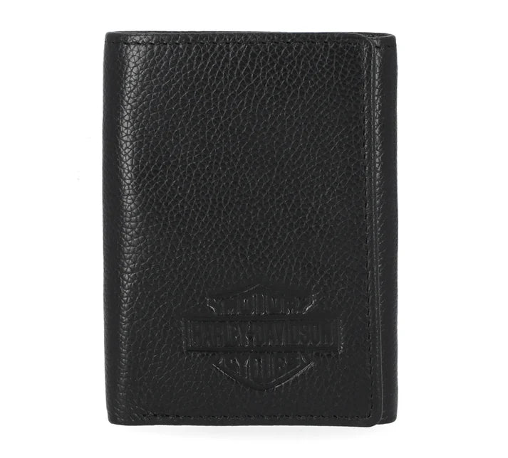 Luxurious genuine pebble leather trifold. This high-quality leather will withstand daily and extended use. Bar & Shield logo embossed. RFID protection, 4 cards slots, ID window, Billfold will keep you organized. PN: MWM006/08