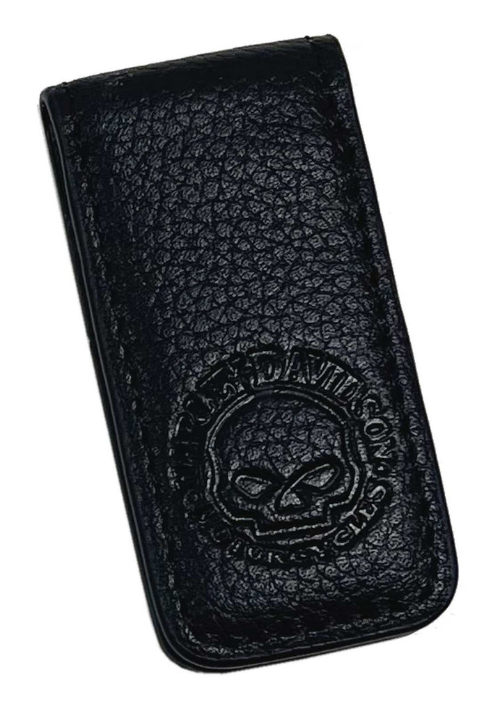 Harley-Davidson® Men's Willie G Skull Leather Money Clip - Black. Features an iconic embossed Willie G Skull logo. Magnetic closure. Constructed from high-quality leather. Size: 3" x 1.5"