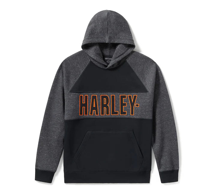 Throw on a layer of bold style with our Bar Font Colorblock Pullover Hoodie. It’s cut from a cozy cotton/polyester fleece in a relaxed fit. Its fabric piecing blends solids with heather material for contrast and a textured look. This men’s hoodie features an overlap hood and rib-knit trim to help keep its shape. Our embroidered appliqué graphics make a style statement on the front and back. Part Number: 96714-25VM