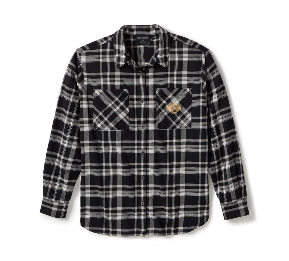 Vintage-loving moto style goes all in on our Patch Woven Long Sleeve Shirt. It’s made from rugged yet lightweight cotton twill that’s peached and washed for softness. This women’s button down delivers an oversized fit with stylish features like a drop shoulder and slight high-low shirttail hem. The front gets a hit of our embroidered Bar & Shield. The back is vibrantly finished with a custom, top-applied back patch inspired by materials sourced from our archives. 100% cotton lightweight twill, peached and washed for softness. Button front, sleeves, and cuffs. Patch chest pockets. Oversized fit. Drop shoulder. Slight high-low shirttail hem. Custom top-applied back patch. Direct embroidery. Digital print on raw edge jersey appliqué applied with single needle stitch.