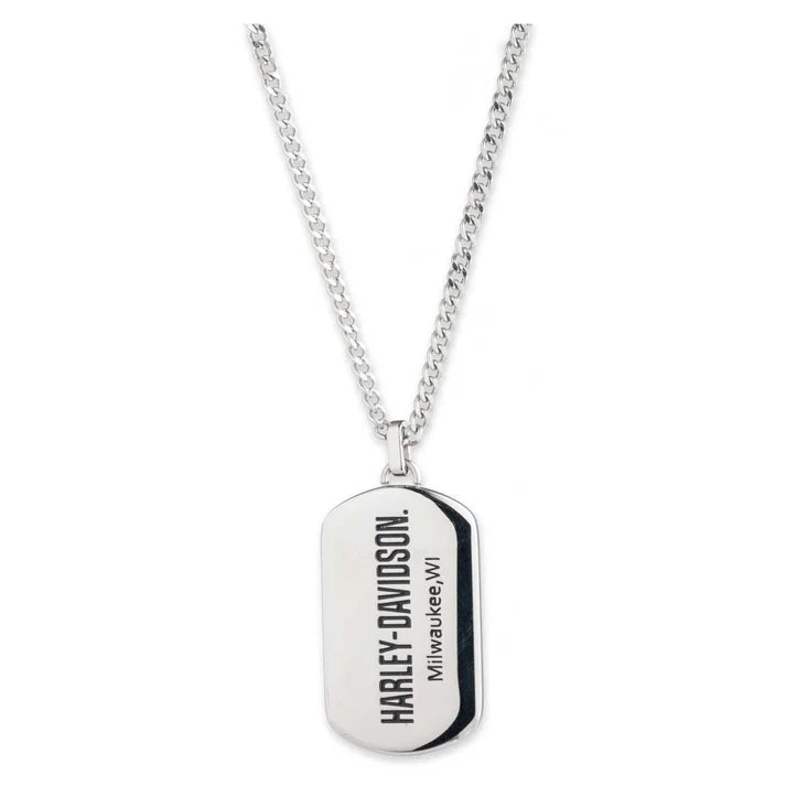 Ride with timeless style. This rugged dog tag pendant features the classic Harley-Davidson® script etched in bold detail. Crafted from high-quality stainless steel, it resists rust and corrosion, ensuring a lasting shine through every ride. The pendant hangs from a 26-inch curb link chain, designed for durability and all-day comfort. A secure lobster clasp keeps it firmly in place whether you’re on the road or off duty. 34N00218 Part Number: 34N00218