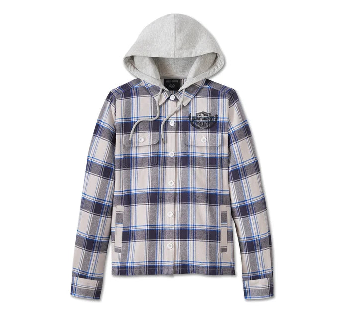 Plaid gets a race-inspired upgrade on the Harley Heritage Classic Shirt Jacket. This women’s hooded flannel shirt jacket is made from heavyweight brushed cotton twill. It features a removable hood that zips on and off, hand-warmer pockets that snap closed, and a hidden snap-down collar that won’t flap around under riding gear. Its fresh plaid pattern plays well with the embroidered seasonal graphics that honor our proud racing history.