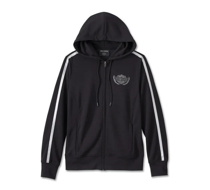 Level up your look with a layer that hails our flat track heritage. The Racing Scuba Zip Front Hoodie transcends the traditional women’s hoodie, thanks to its scuba jersey blend that’s equal parts sturdy, smooth, and stretchy. It features flattering princess seam, reflective taping for day-and-night visibility, and drawstrings with dipped rubber ends. This sporty style is finished with a winning mix of race-inspired graphics.