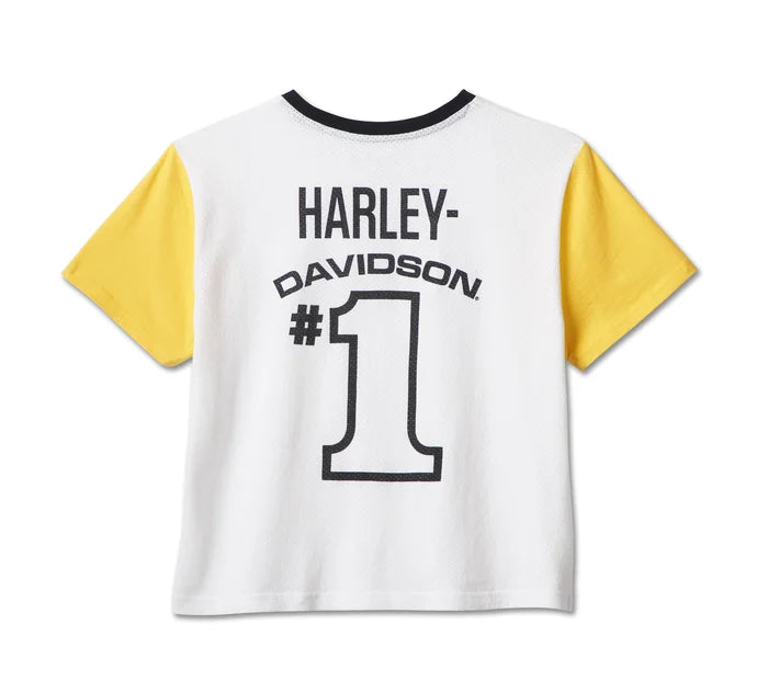 Second-place stye is simply not an option on our #1 Racing Boxy Mesh Tee. Its cropped silhouette is crafted from cotton with a hit of polyester in a small hole mesh for added texture and breathability (zoom in to see). This short sleeve women’s boxy t-shirt is boldly finished with contrasting colors and seasonal graphics that pay homage to our championship racing legacy.
