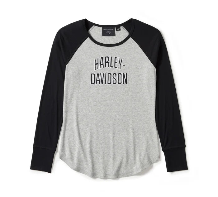 Keep it casual yet moto-inspired in our Essential Arched Font Long Sleeve Raglan. Crafted from a ribbed modal/polyester/spandex blend for move-with-you comfort in a textured look (zoom in to see). This women’s Raglan baseball style tee classically features contrast raglan sleeves and a flattering scoop neckline. It’s finished with our most iconic Bar & Shield on back and arched graphics on front that mimic our 1930s racing jerseys.
