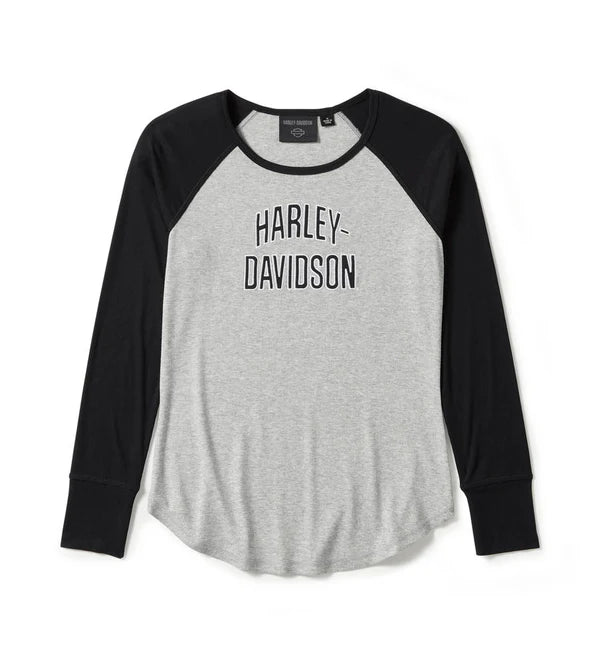 Keep it casual yet moto-inspired in our Essential Arched Font Long Sleeve Raglan. Crafted from a ribbed modal/polyester/spandex blend for move-with-you comfort in a textured look (zoom in to see). This women’s Raglan baseball style tee classically features contrast raglan sleeves and a flattering scoop neckline. It’s finished with our most iconic Bar & Shield on back and arched graphics on front that mimic our 1930s racing jerseys.