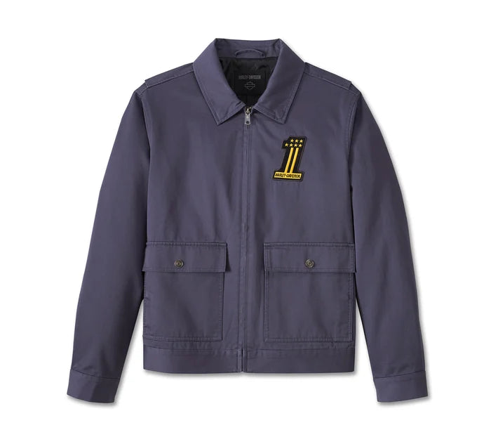 Honor our winning flat track heritage in style on the Limited-Edition #1 Racer Jacket. Its mechanic-fit silhouette is crafted from rugged yet breathable heavyweight cotton twill that’s washed for softness. It uniquely features an action back, dual-entry pockets, hidden snaps to keep your collar down, and a hit of reflective material in the graphics for added visibility. This men’s jacket earns extra style points for its race-inspired artwork on the front and back. In fact, the #1 Logo gracing the front was originally created in 1969 to celebrate our AMA Grand National Championship Title. Remember to order ASAP—quantities are limited.